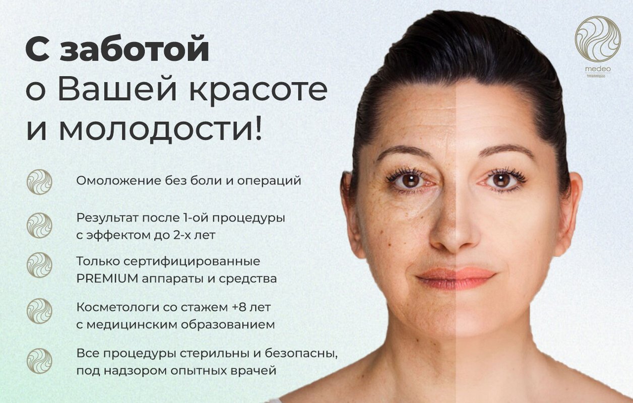 Как эффективно приумножить красоту своего тела? Легко, особенно для клиентов клиники косметологии и эстетической медицины Медео. Это не обычный медицинский центр с общим перечнем услуг - здесь практикуют более индивидуальный подход и составляют систему омоложения организма, исходя из многих параметров. Применяемые здесь методы соединяют в себе мировой опыт и потому соответствуют самым высочайшим стандартам. Мы предоставляем возможность записаться на консультацию к косметологу на удобное для вас время. После наших процедур вы сразу сможете увидеть результат. Клиника косметологии и эстетической медицины Медео сделает все для того, чтобы вы гордились своей внешностью.
